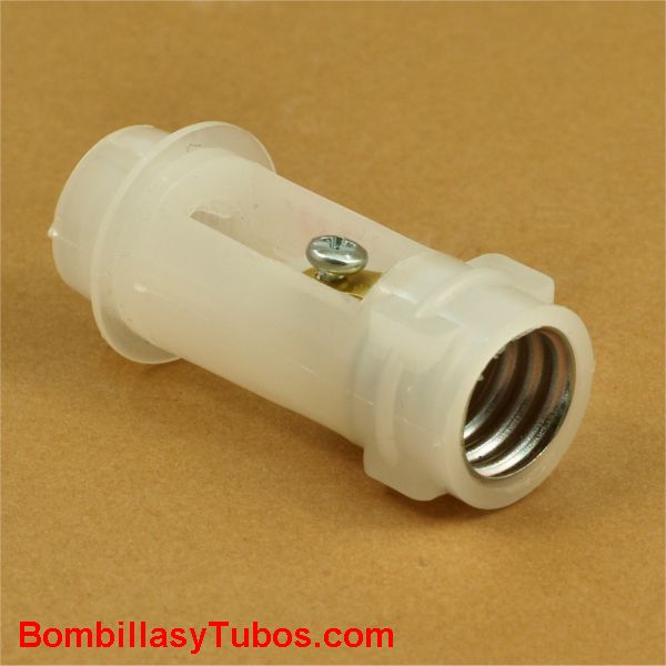 Descripcion del producto Portalamparas rosca E14 5cm para instalación interior en velones. Portalamparas plastico para instalacion en interior de velones en lámparas clasicas de brazos. Rosca E14, Portalamparas e14, miñon, para instalacion en interior de velones. Contacto mediante tornillos. Material plastico. La parte trasera lleva rosca metrica 10. medidas 23x49mm. Permitido solo para instalacion con funda exterior