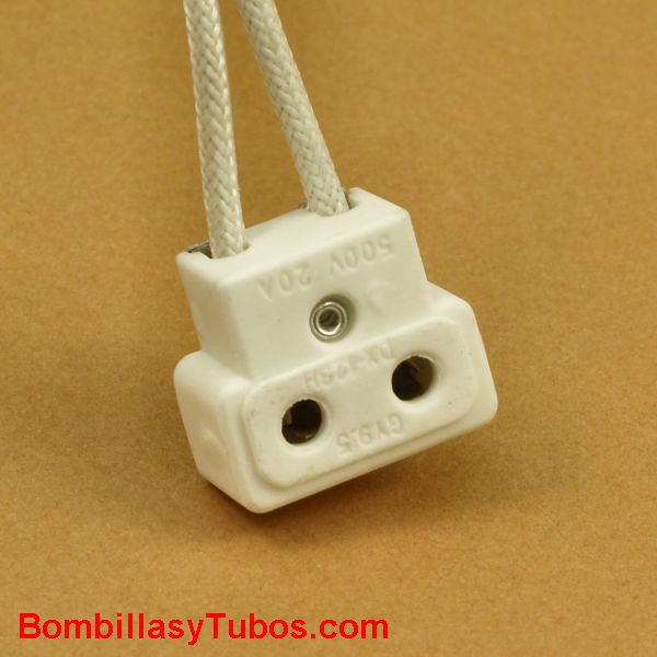 Descripcion del producto Portalamparas GX9,5 ceramica y cable silicona+fibra vidrio. Portalamparas conector GX9,5, G9,5, HPL . Cable de 20cm de silicona forrado fibra vidrio, Portalamparas para conexión GX9,5, G9,5 lamparas tipo HPL. Fabricado en ceramica y cables de silicona forrados de fibra de vidrio para aguntar bien el calor de los focos de teatro. Longitud del cable 20cm